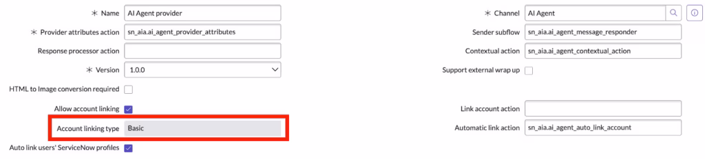 These new ‘AI Agent’ channel providers shared a number of configurations such as using message authentication to validate inbound API requests. Because of this design, authenticating to any of these providers required only the single, non-rotating static client secret that they had been configured with. It’s reasonable to assume ServiceNow chose this approach to provide a more seamless experience for end users, fully leveraging the transparent nature of auto-linking. However, the implementation suffered from two primary problems.