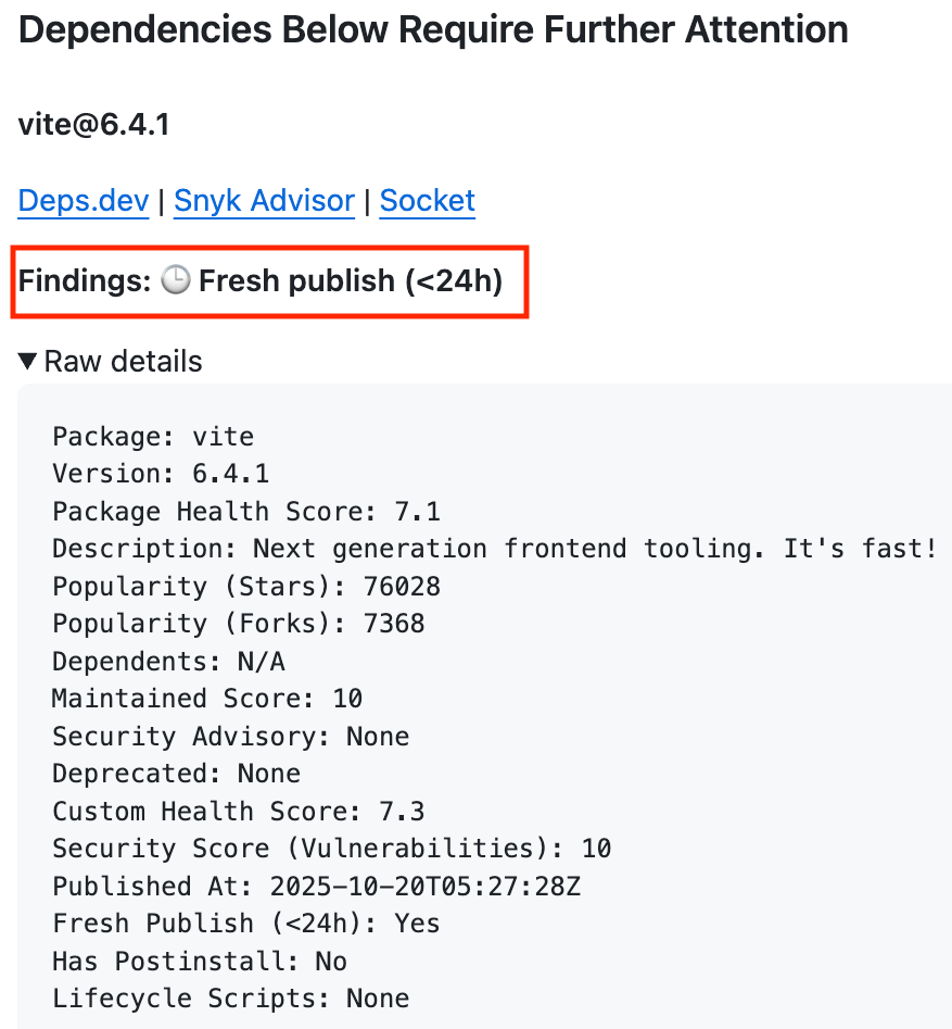 This approach directly addresses the kinds of attacks we’ve seen in the wild. In debug/chalk style compromises, malicious versions appeared suddenly in popular packages. Those fresh, untested releases are exactly what our GHA flags. If a PR tries to pull one in (manually or via renovate-bot), the action will flag the fresh publish and the lack of healthy signals, fail the job, and add a security review label before the version reaches the main branch.