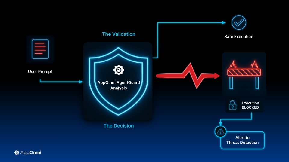 It proactively monitors and blocks risky prompts in real time to protect these AI agents. Like a firewall for AI agents, AppOmni AgentGuard reviews every prompt before it runs, identifying malicious or unsafe instructions and blocking risky actions before they can cause harm.