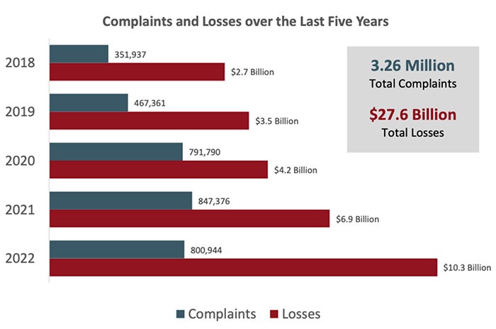 The financial toll of cybercrime is increasing at a significant pace, even as the total number of crimes reported marginally decreased year-over-year. The FBI reports that total costs from cybercrime for the current five-year period (2018-2022) reached $27.6 billion.