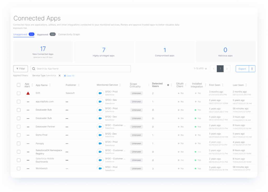 Salesforce is rarely a standalone app. AppOmni helps identify risky third-party apps connected via OAuth, like data scraping tools or browser extensions that may be exfiltrating customer data.