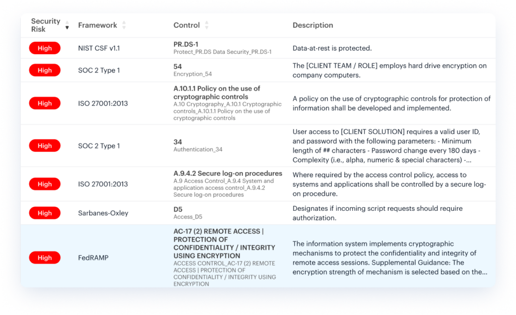 Use out-of-the-box baseline security policies and map to compliance frameworks required by your company. This includes NIST CSF, NIST-90053, SOC2, Sarbanes Oxley, and ISO 27001