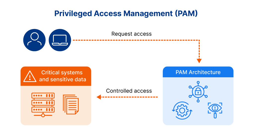 Privileged Access Management (PAM) is a cybersecurity strategy that controls, monitors, and secures access to an organization’s most critical systems and sensitive data. PAM solutions protect privileged accounts (those with elevated permissions beyond standard users) from misuse by managing and enforcing administrative entitlements, including the addition and removal of elevated access, alongside strict access controls, continuous monitoring, and automated credential management.